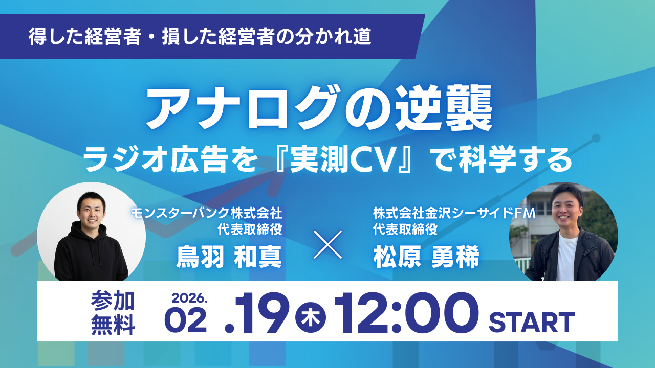 本ウェビナーでは、数々のビジネスを成功させてきた株式会社モンスターバンク代表・鳥羽と、地域メディアの最前線に立つ株式会社金沢シーサイドFM・松原氏が登壇。「アナログだから検証できない」というこれまでの常識を打ち破り、ラジオ広告の真価をデータで解明する具体的なスキームを公開します。